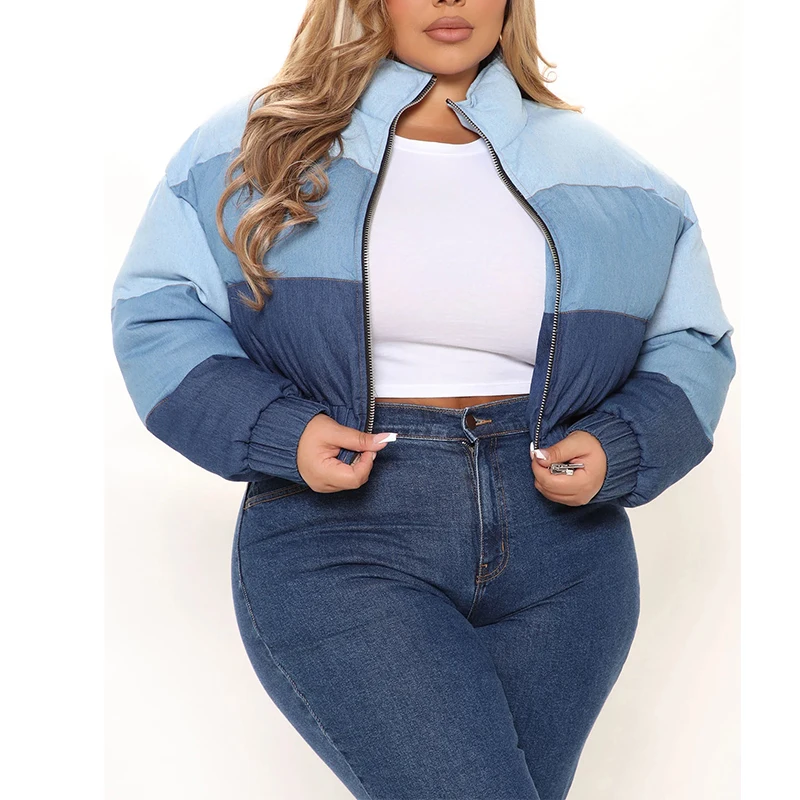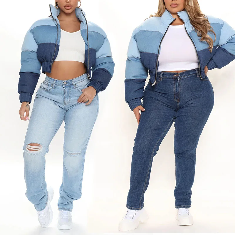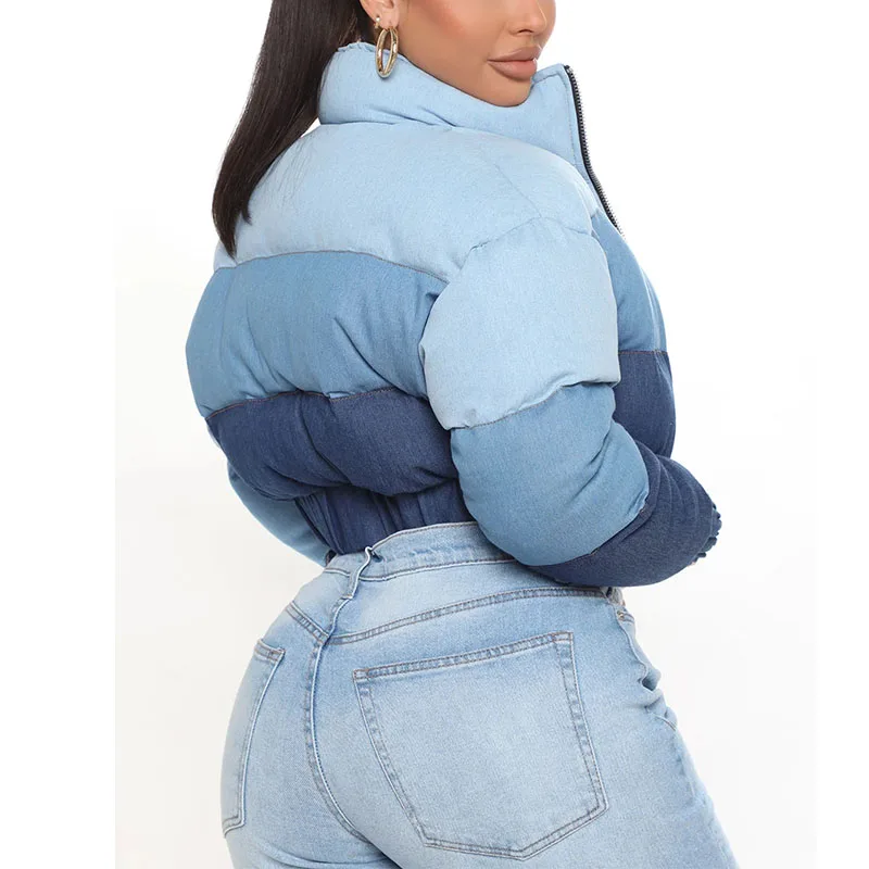 Factory High Quality Denim Jean Cotton Splicing Cropped Puffer Jacket Women Custom Thick Y2K Streetwear Down Coat